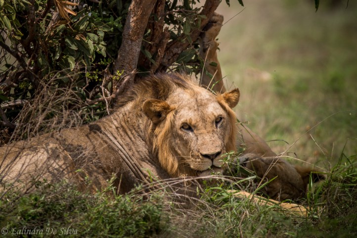 As we getting closer to Ashnil, we saw a tour van parked. Like a lion going for the kill we moved towards the van. To our amazement, there were two lions by the side of the road sitting near a bush, chilling away. When we looked closer, it was male and a female! What does this mean? Usually a couple would move away from the pride for some lone time!! This was a mating pair!! Best part was it was the middle of the day and it was unlikely these two lions would move from where they were. And the better part was that we were not even 2 minutes from the lodge!
