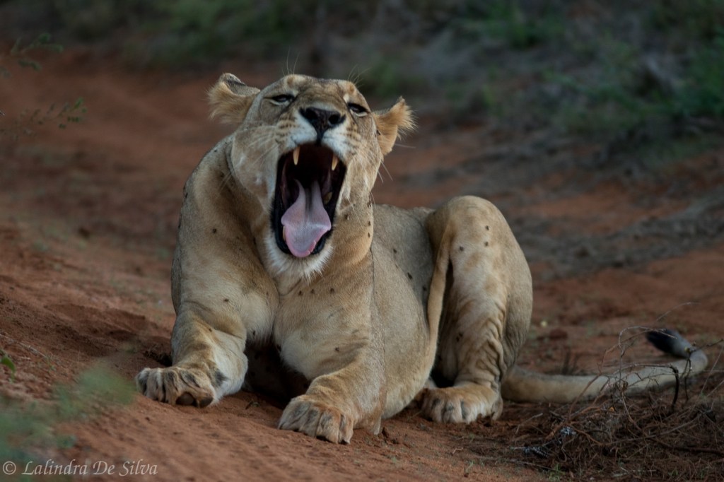 So, what did we do. After spending nearly an hour with these two, we realized that they were not going anywhere in this scorching heat! Thus we decided to head towards the lodge to check in and have our lunch! After a quality buffet, we chilled for another hour and we went towards our mating couple again. What an evening it was! We spent nearly three ours parked next to these two lions, photographing them mating, pooping and yawning!