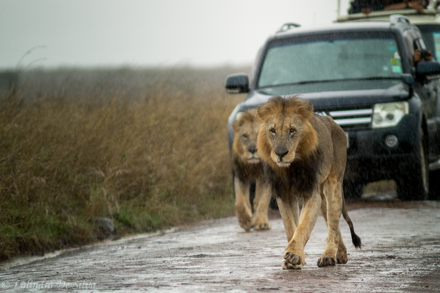 After spending nearly an hour with three rhino’s we moved forward. Next on the agenda was to spot the King of the jungle, the lion. We made our way back to the main road and to our surprise there was a heard of tourist vans coming towards us in a distance. But they were coming really slowly. To my amazement, they were following two male lions who were walking on the main road and the best part was that the lions were walking directly towards our vehicle!!