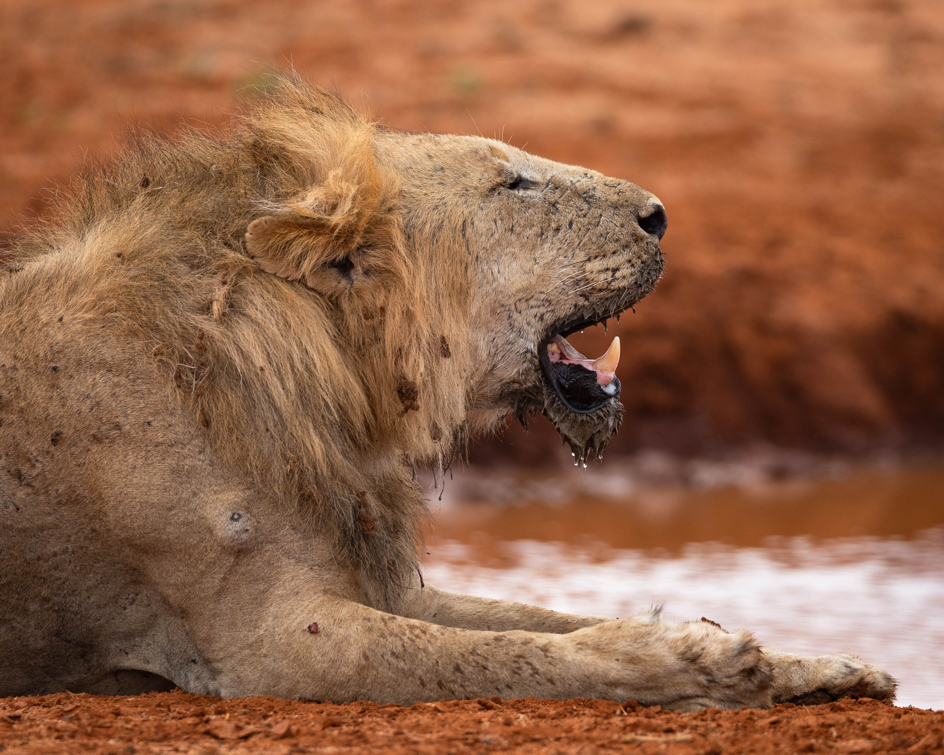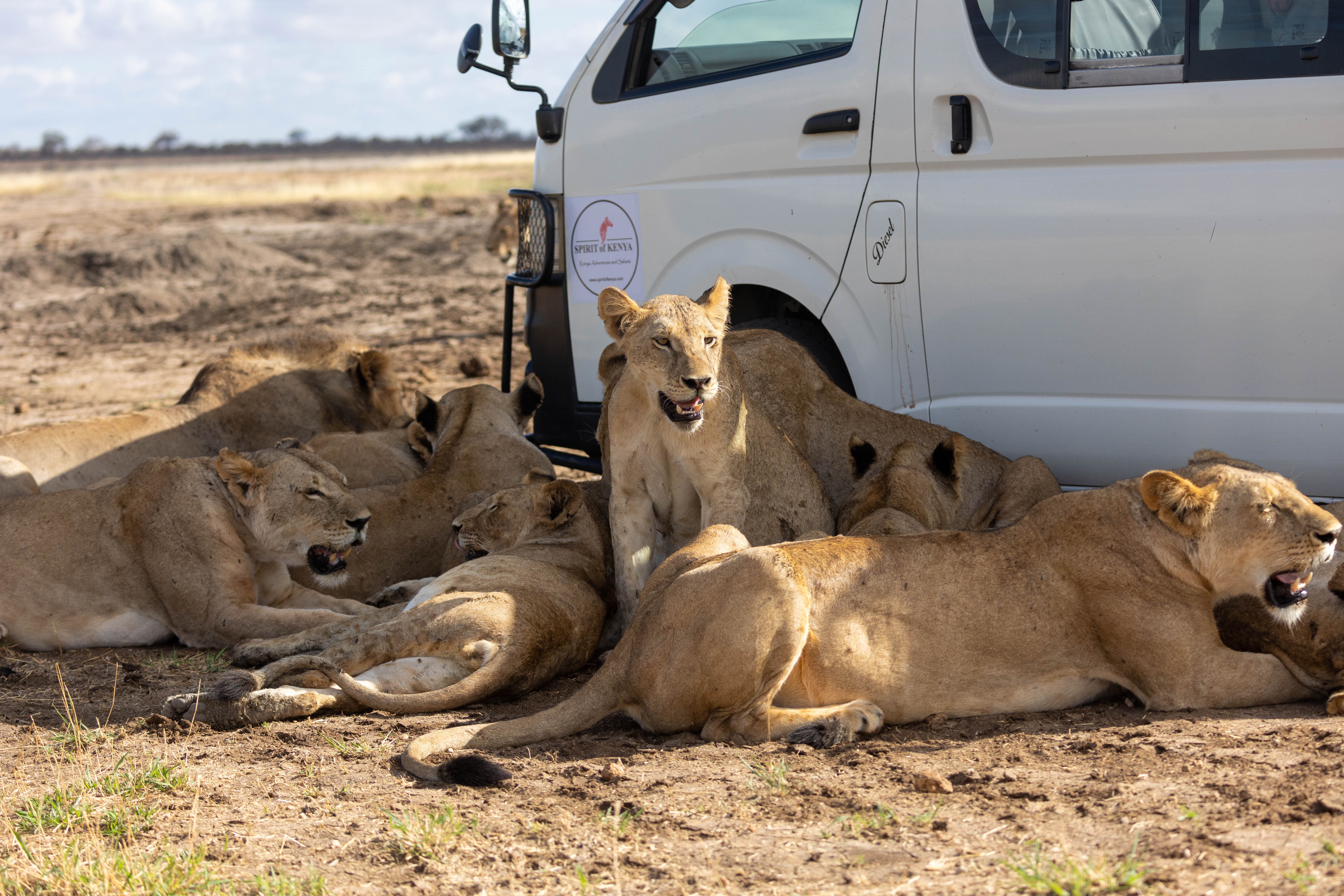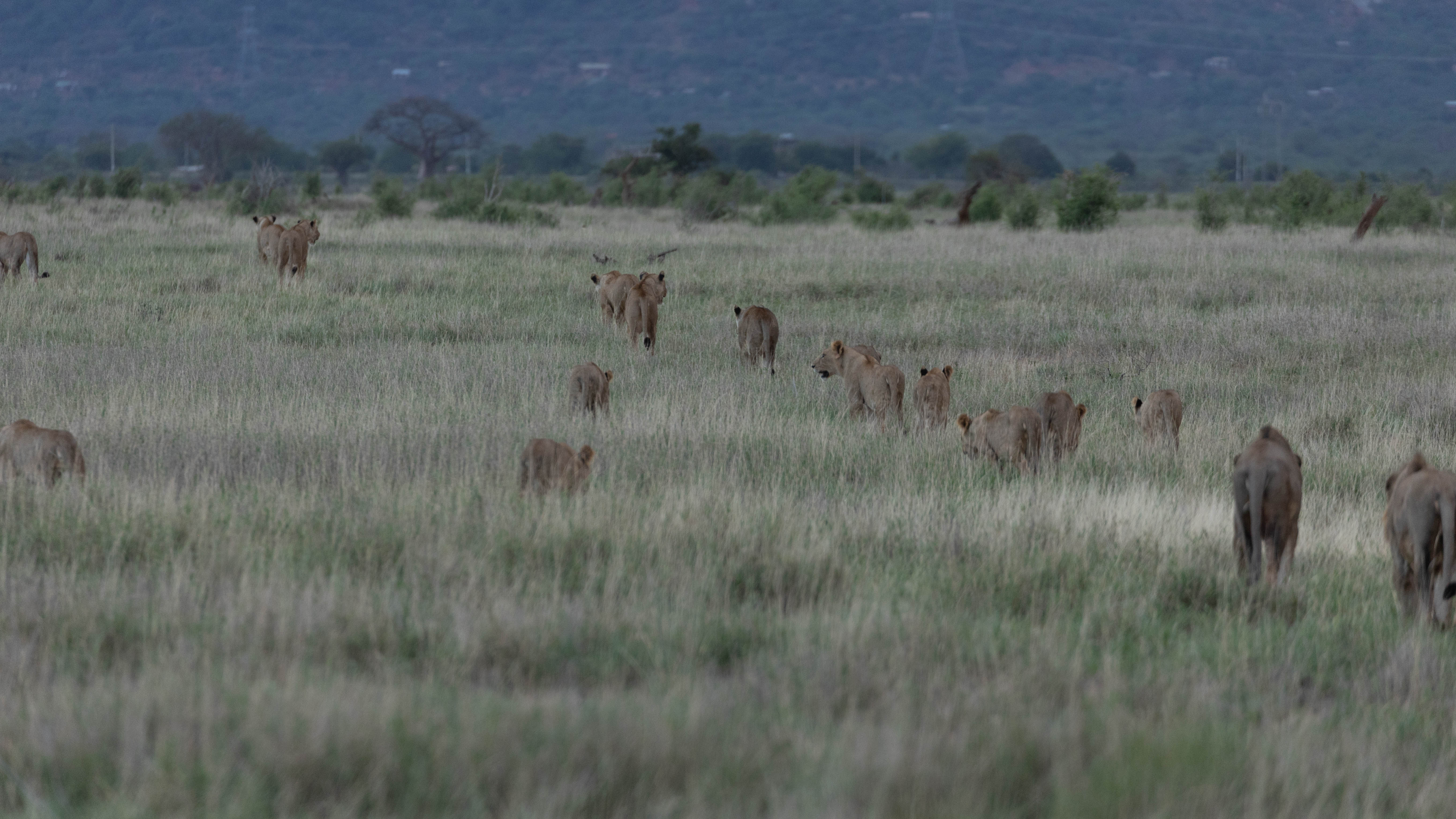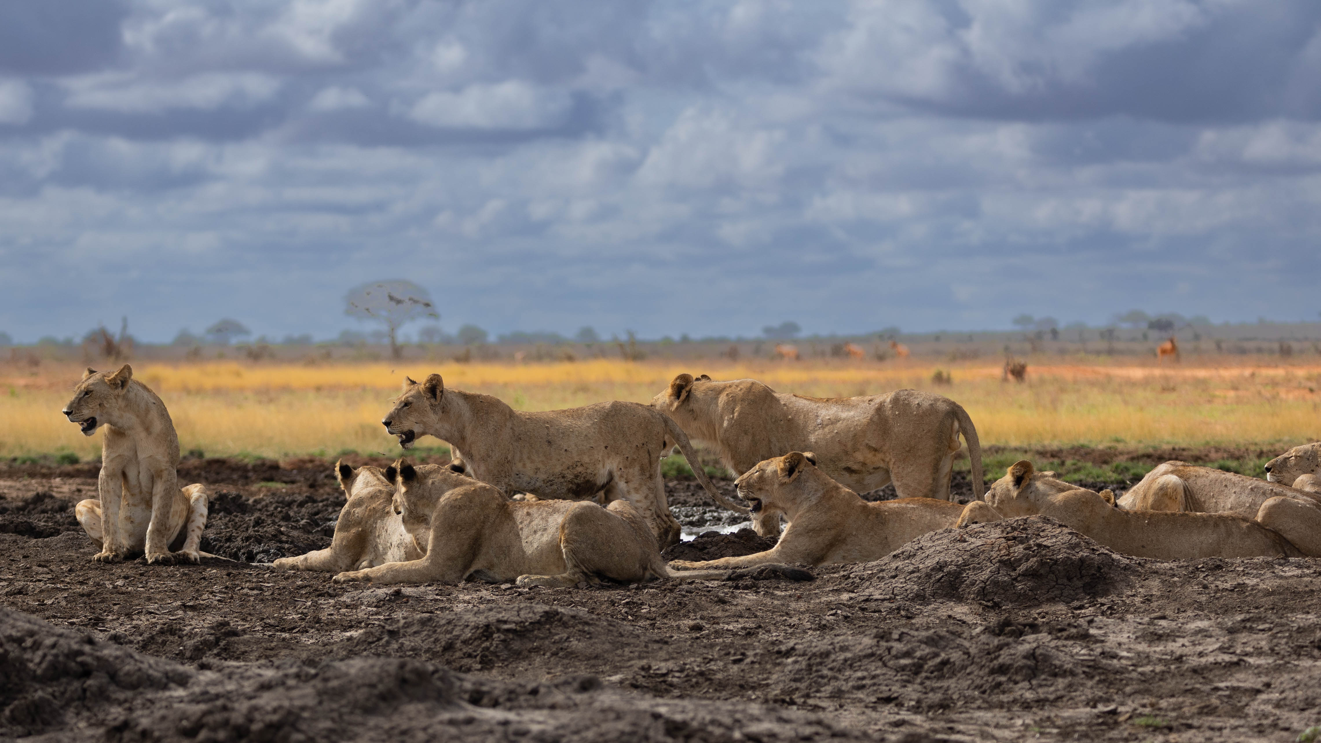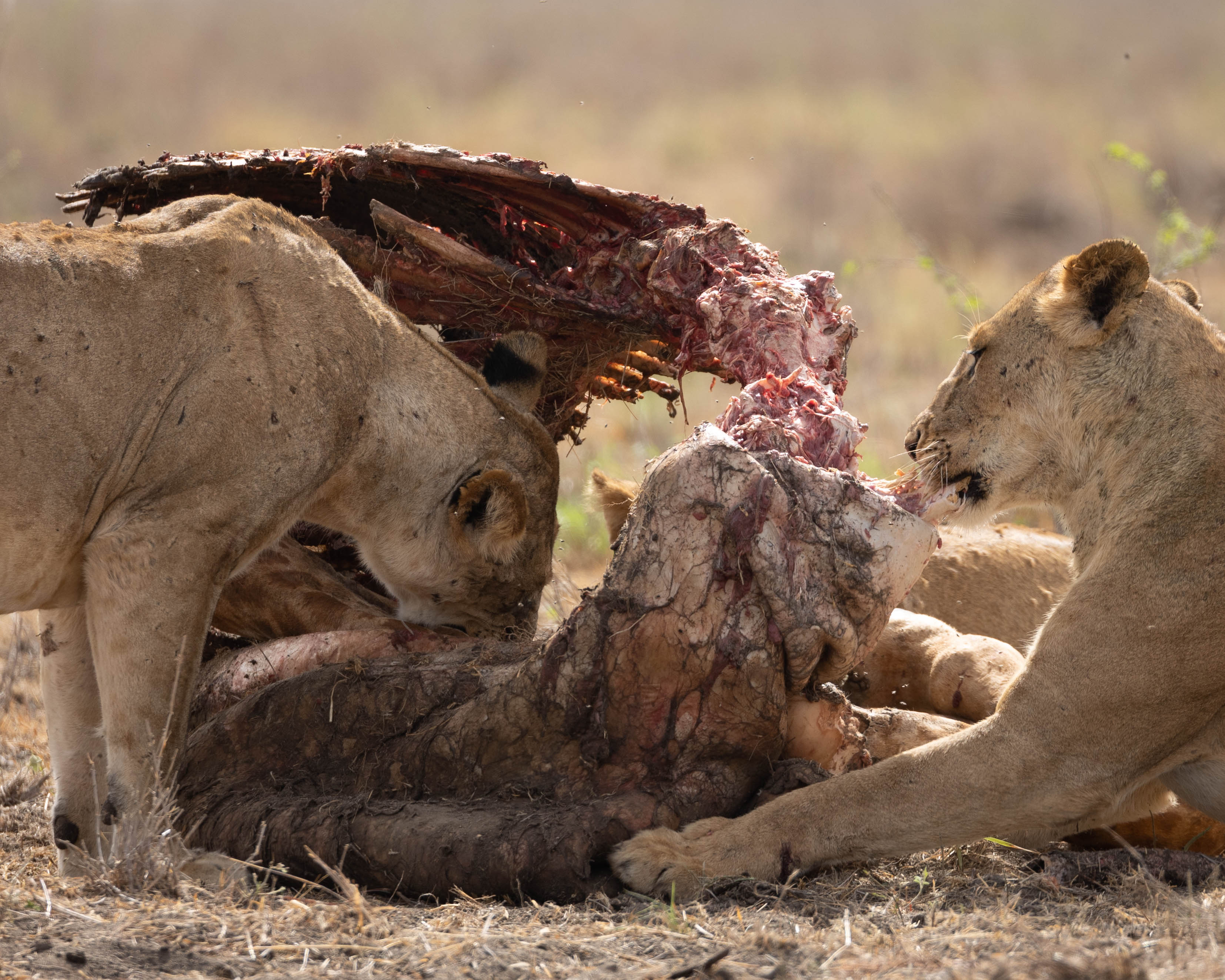 We continued our journey, we heard that the famous pipeline pride had taken down a giraffe and was in the open. The pipeline pride is perhaps the biggest pride in Tsavo at the moments with nearly 20 lions. We rushed to the pipeline area and there they were! Out in the open feasting on their kill and drinking water. What a sight it was! To see the entire pipeline pride together!