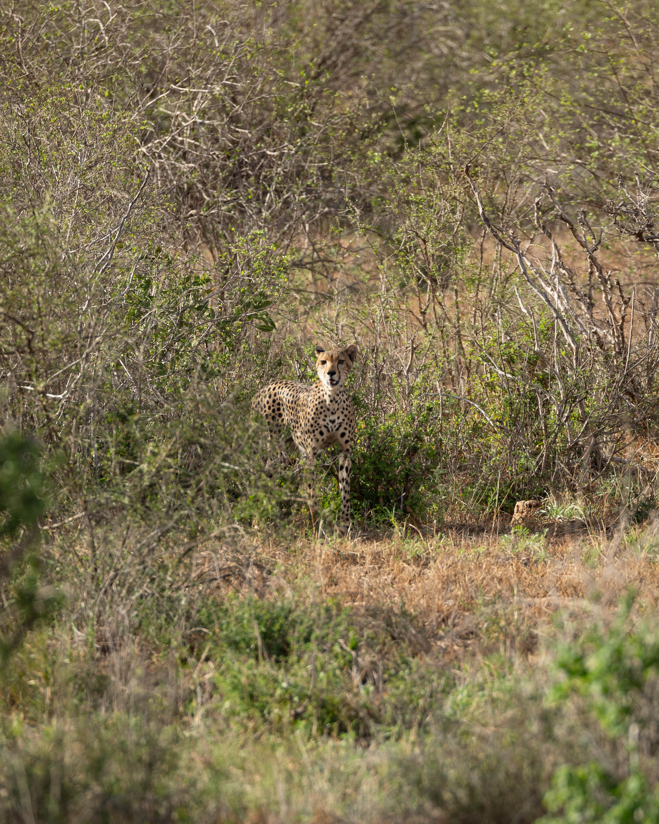 What a morning it was! We headed to Sentrim Tsavo our preferred lodge in Tsavo East and settled down. That evening we again encountered the same pride. After an eventful day we called it a night after an amazing dinner. Next day we left the lodge by sharp 6 for our morning drive. And then there they were! Two cheetah brothers! We were so lucky to encounter two cheetahs. They were bit shy though moment they saw us they made it into the bushes